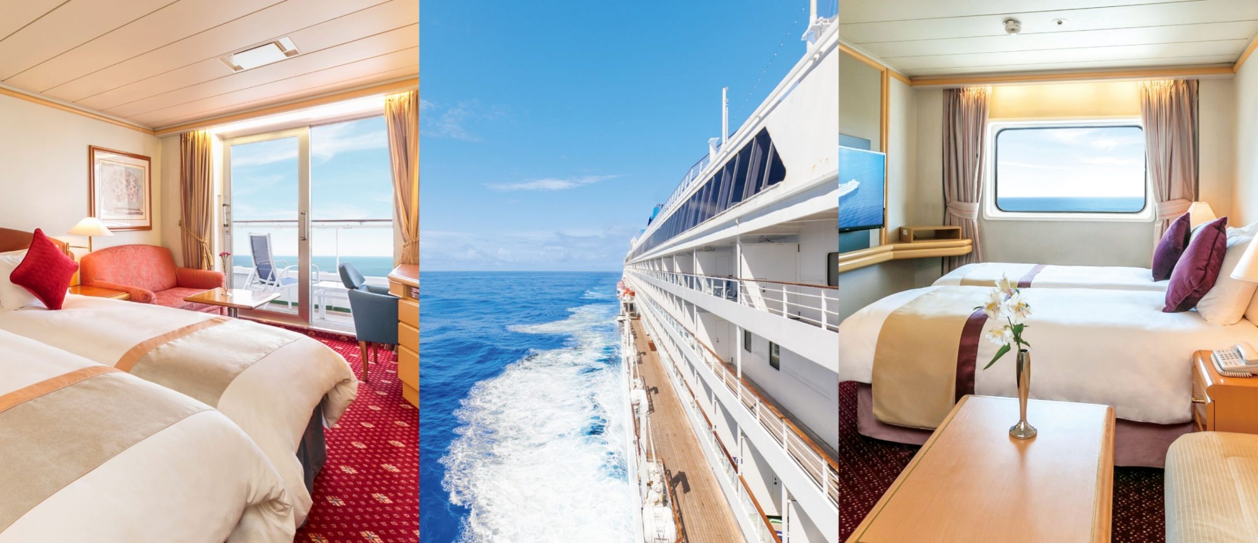 全室が海に面した客室には、バスタブとツインタイプのベッドを完備。クルーズライフを快適にするさまざまな設備をご用意しております。洋上のホテルにふさわしい、洗練された雰囲気のインテリアの中で、くつろぎのプライベートタイムをお過ごしください。