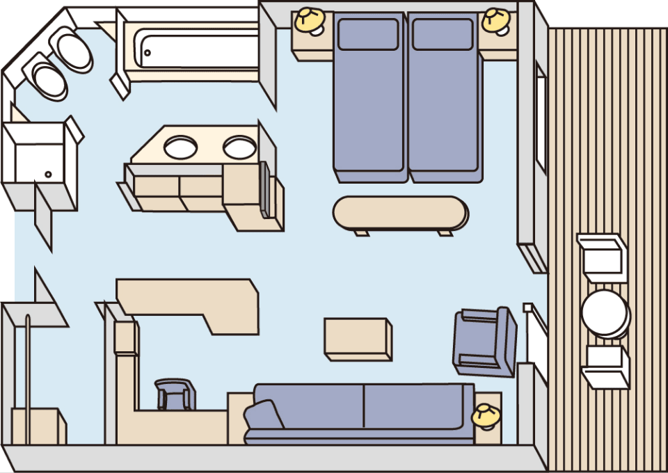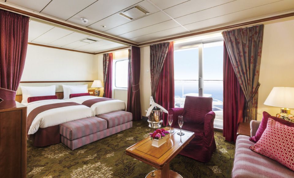 広々としたリビングエリアは、赤または青のインテリアでまとめられています。 プライベートバルコニーからは、ゆっくりと海の景色を眺めることができます。ルームサービスを利用して、バルコニーでのブランチやティータイムはいかがですか。 天気の良い日に青い海を眺め、潮風を感じながら、優雅な時間をお過ごしいただけます