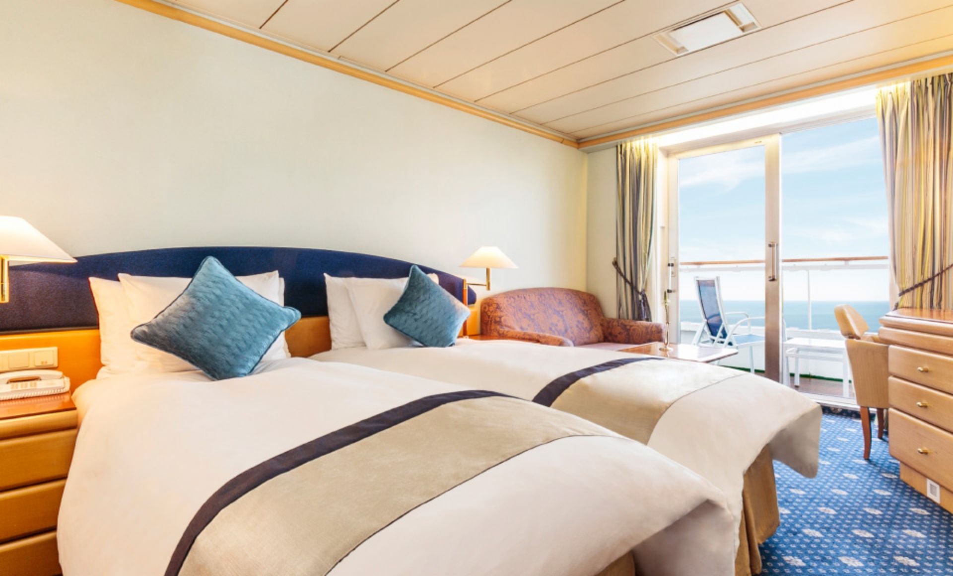 プライベートバルコニーでお客さまだけの特別な時間をお過ごしください。海から見る景色は旅の思い出を忘れられないものにしてくれます。