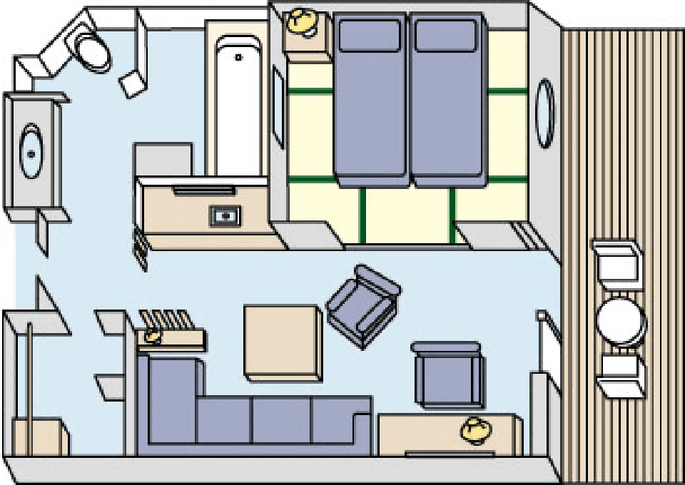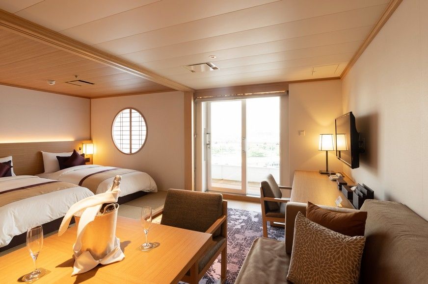 落ち着いた和の雰囲気と洋室の快適さを兼ね備えたジャパニーズモダンスイート。2部屋限定のスペシャルルームです。 室内にはミラーディスプレイテレビやミニシンクを設置し、室内で快適にお過ごしいただけるようになりました。バスルームには大きな窓を設け、ベッドルームのその先の丸窓を望むことができます。 また、お天気の良い日はルームサービスを利用して、バルコニーでのブランチやティータイムはいかがですか。青い海を眺め、潮風を感じながら、優雅な時間をお過ごしいただけます。