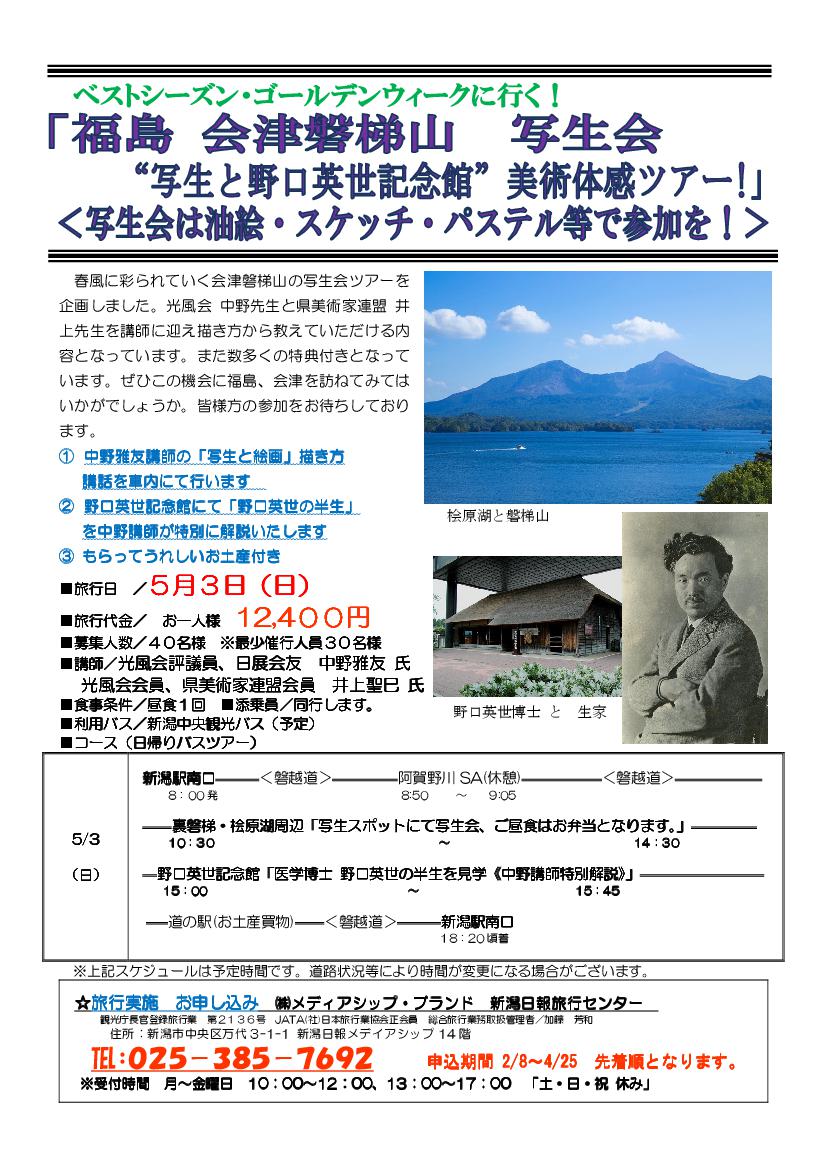 春風に彩られていく会津磐梯山の写生会ツアーを企画しました。光風会 中野先生と県美術家連盟 井上先生を講師に迎え描き方から教えていただける内容となっています。また数多くの特典付きとなっています。ぜひこの機会に福島、会津を訪ねてみてはいかがでしょうか。皆様方の参加をお待ちしております。