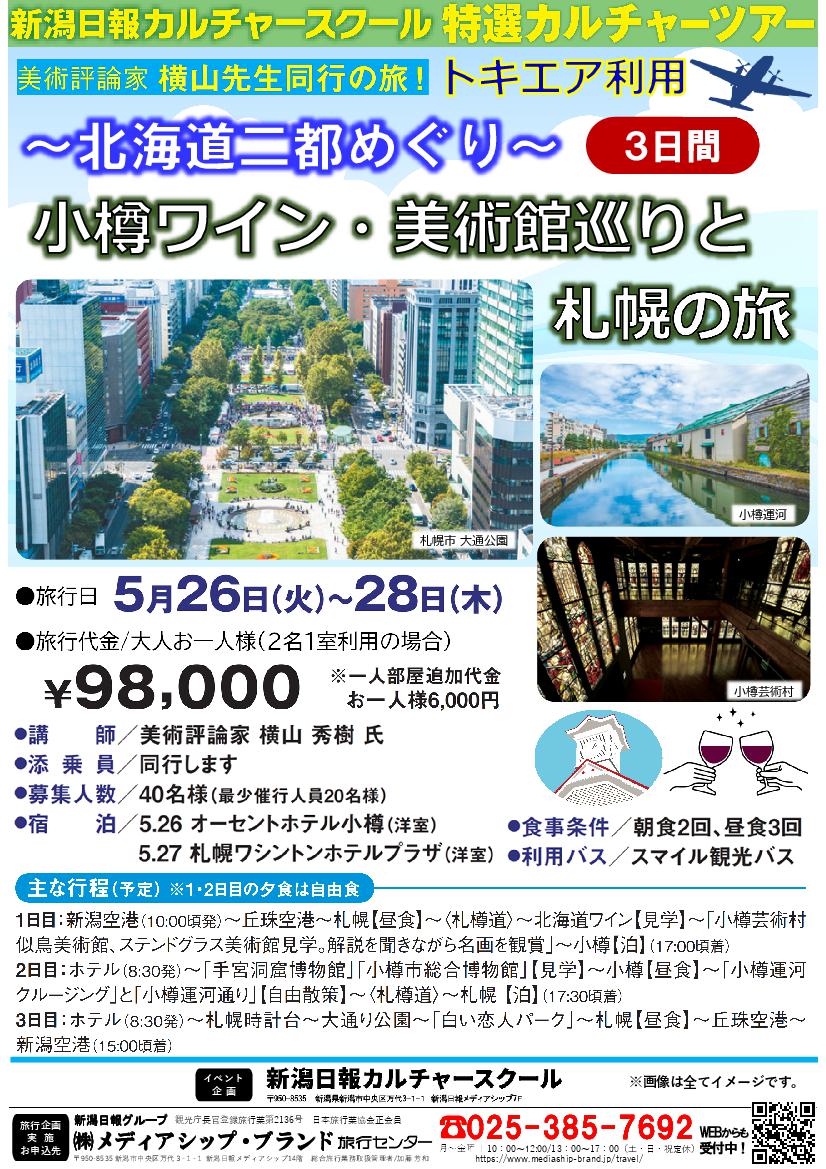 | 宿泊予定ホテル | 5/26 オーセントホテル小樽(洋室) 5/27 札幌ワシントンホテルプラザ(洋室) |