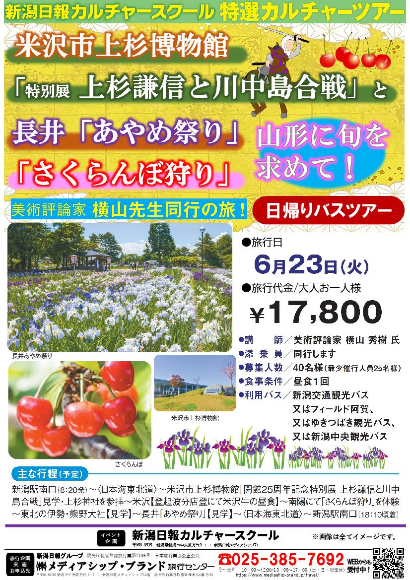 米沢市上杉博物館「特別展 上杉謙信と川中島合戦」と長井「あやめ祭り」、「さくらんぼ狩り」山形に旬を求めて! 日帰り
